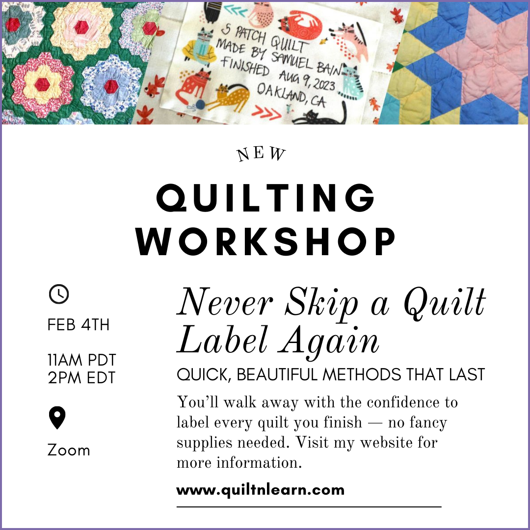 Prompted by the loss of women's quilting history and the importance of labelling I so strongly believe in, this workshop is for any quilter who wants to honor their work, their story and every quilt you've ever made. You'll come away from this one hour workshop with three simple, beautiful solutions you can start using today.